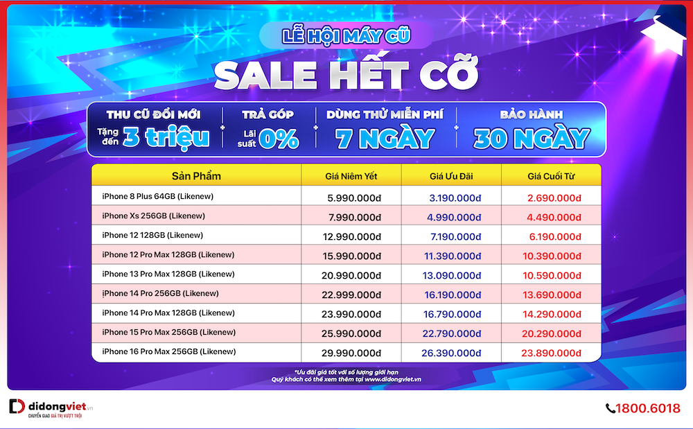 Đón đầu xu hướng, hệ thống Di Động Việt chính thức triển khai chương trình “Lễ hội máy cũ” diễn ra từ ngày 25/10 – 30/10, mang đến cơ hội vàng sở hữu các mẫu iPhone LikeNew với mức giá tối ưu nhất.