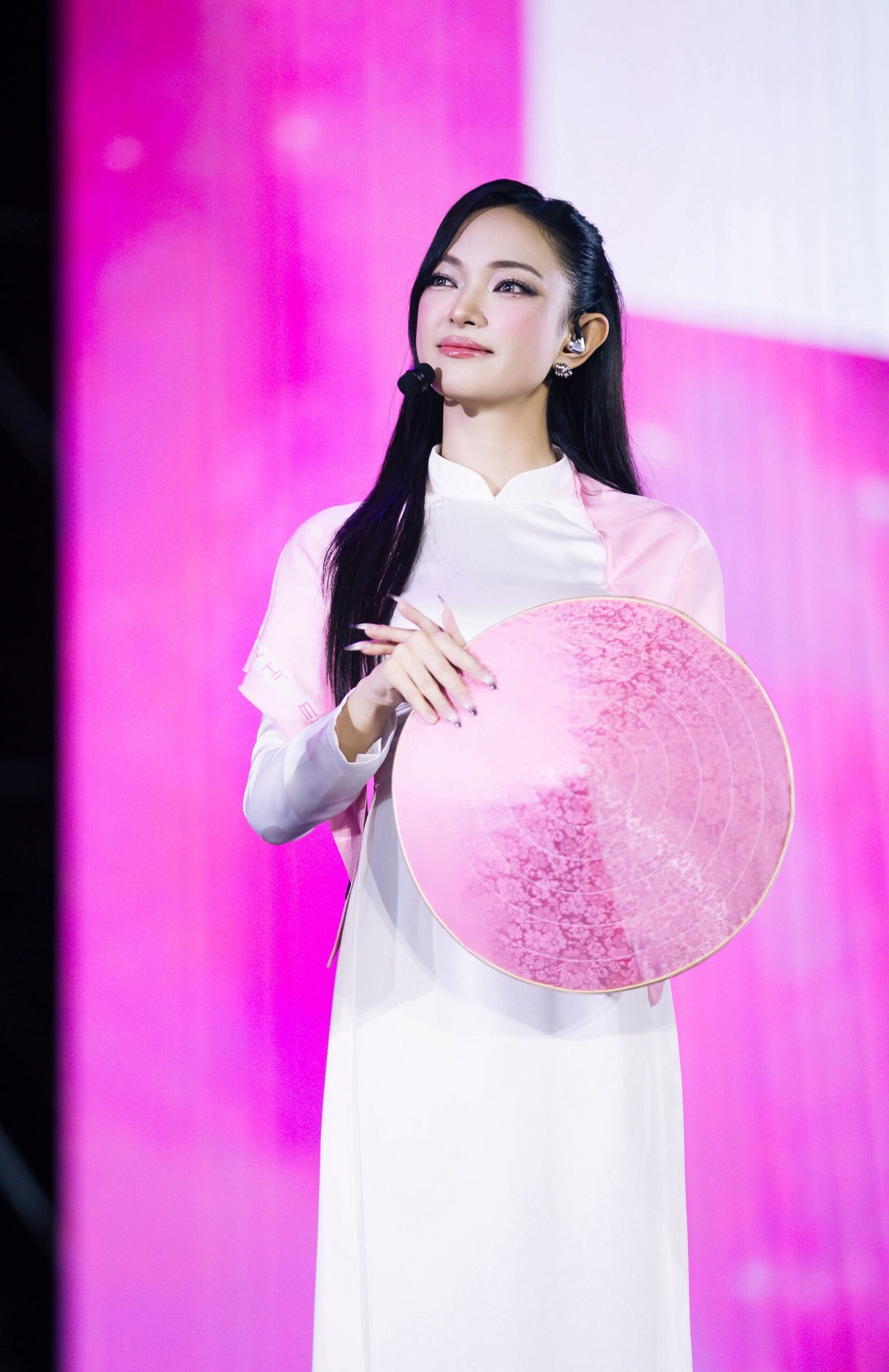 Mở màn với Việt Nam hơn từng ngày, Châu Bùi xuất hiện trong tà áo dài truyền thống, nhẹ nhàng và đầy cảm xúc. Đây là lựa chọn khởi đầu giàu ý nghĩa, mang đến không khí trang trọng và gần gũi, đồng thời khắc họa một hình ảnh nữ tính, dịu dàng của cô.