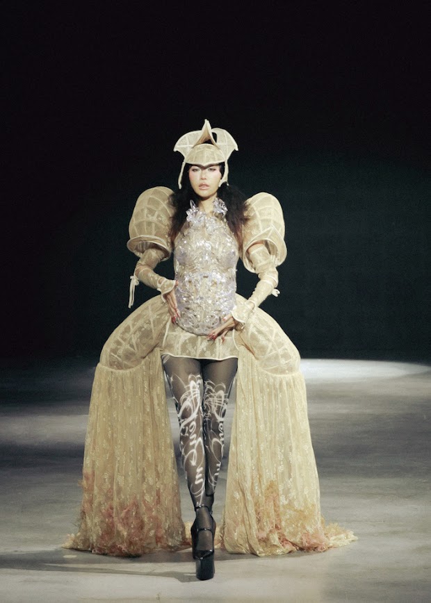 Minh Tú xuất hiện trong phần mở màn trong bộ trang phục được thiết kế khá độc đáo trong bộ sưu tập “No Season 2026: 245KM” của NTK trẻ Quách Đắc Thắng. Bộ trang phục là sự hòa quyện tinh tế giữa chất liệu voan màu beige nhẹ nhàng và những chi tiết tạo khối mang đậm tính điêu khắc. Nổi bật nhất là phần thiết kế 3D bằng nhựa tỉ mỉ, ôm trọn từ ngực đến bụng người mẫu, tạo nên một tổng thể đầy nghệ thuật.
